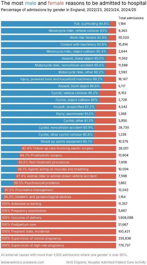 Ce que je voulais vous montrer par exemple c’est ce tableau des motifs d’admissions dans les hôpitaux anglais entre les deux sexes (expression qui m’évitera de dire homme-femme ou femme-homme au risque de blesser la moitié de l’humanité qui n’aurait pas son genre en premier).