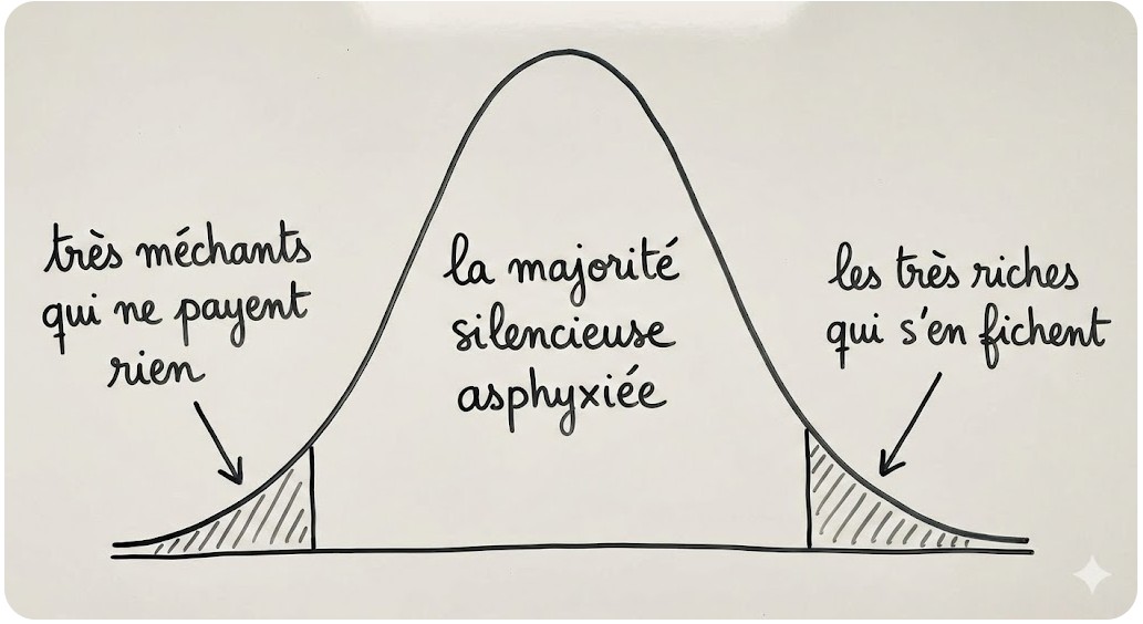 Quand nous en sommes là, il est évident que l’Etat ne fait peur plus qu’aux gentils, les méchants eux ont définitivement compris que l’on peut faire à peu près n’importe quoi quand on est du côté gauche de la courbe de Gauss ! Au milieu vous avez l’écrasante majorité des gentils qui raquent pour tous les autres et pour qui la loi est dure, et à la droite, les riches, qui eux s’en fichent !