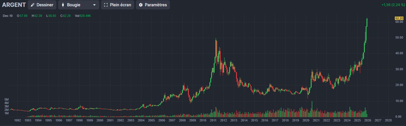 Logiquement les marchés boursiers sont contents et montent, l’or et l’argent repartent à la hausse. L’argent qui était en retard, lui, explose comme vous pouvez le voir sur le graphique ci-dessous.