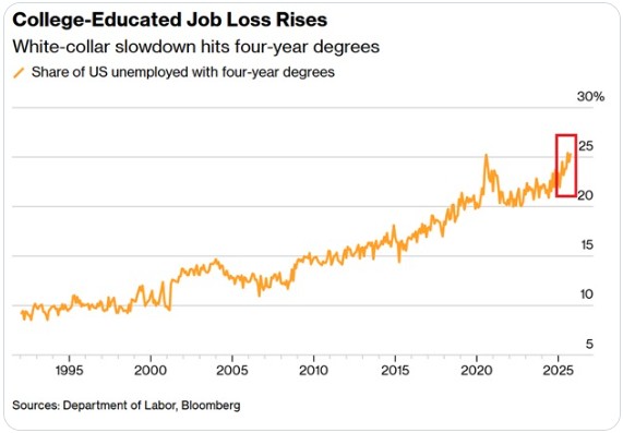 Quand vous regardez ce graphique, si je vous dis qu’on voit déjà les effets de l’arrivée de l’IA sur le taux de chômage des diplômés aux Etats-Unis les fameux cols blancs, les cadres, vous auriez toutes les raisons de me croire. D’ailleurs c’est peut-être le cas. Je pourrais même dire que c’est même sans doute le cas, mais cela reste un peu trop tôt pour l’affirmer de manière péremptoire et définitive, surtout si on nuance l’analyse de ces chiffres avec d’autres chiffres !