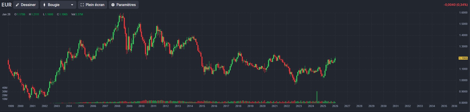 Surtout si vous regardez attentivement ce graphique depuis 1999, il n’y a, à ce stade, rien de dramatique et la volatilité du dollar est dans son évolution parfaitement normale.