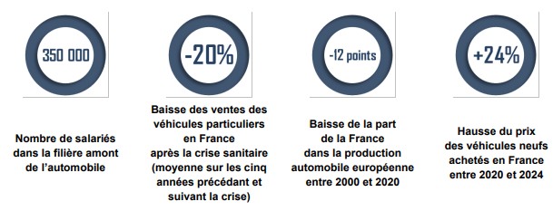 Alors qu’elle a engagé des investissements colossaux pour atteindre les objectifs européens de réduction des émissions de gaz à effet de serre à échéance 2025 et la fin de la vente des véhicules thermiques neufs en 2035, l’industrie automobile française, déjà fragilisée par la crise de la Covid et les conséquences de la guerre en Ukraine, est confrontée à une concurrence internationale de plus en plus vive et à une baisse globale des ventes de véhicules, notamment électriques.
