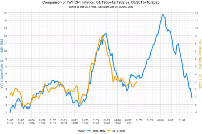 Sur ce graphique, vous pouvez voir la mise en perspective de deux pics inflationnistes, celui des années 70-80 et celui que nous venons de vivre. Les courbes se superposent presque parfaitement sur la première phase, reste à se demander si nous allons vers un second pic inflationniste, plus violent encore comme cela avait été le cas au tout début des années 80.